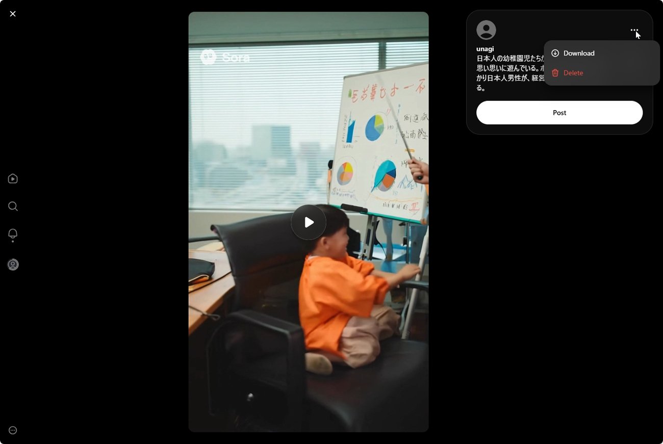「POST」をクリックすると、Sora 2ユーザーに共有される。これが、Sora 2のもう一つの大きな特徴となる。Sora 2はYouTube ShortsやTikTokのような短尺動画の共有プラットフォームも目指しているのだ。